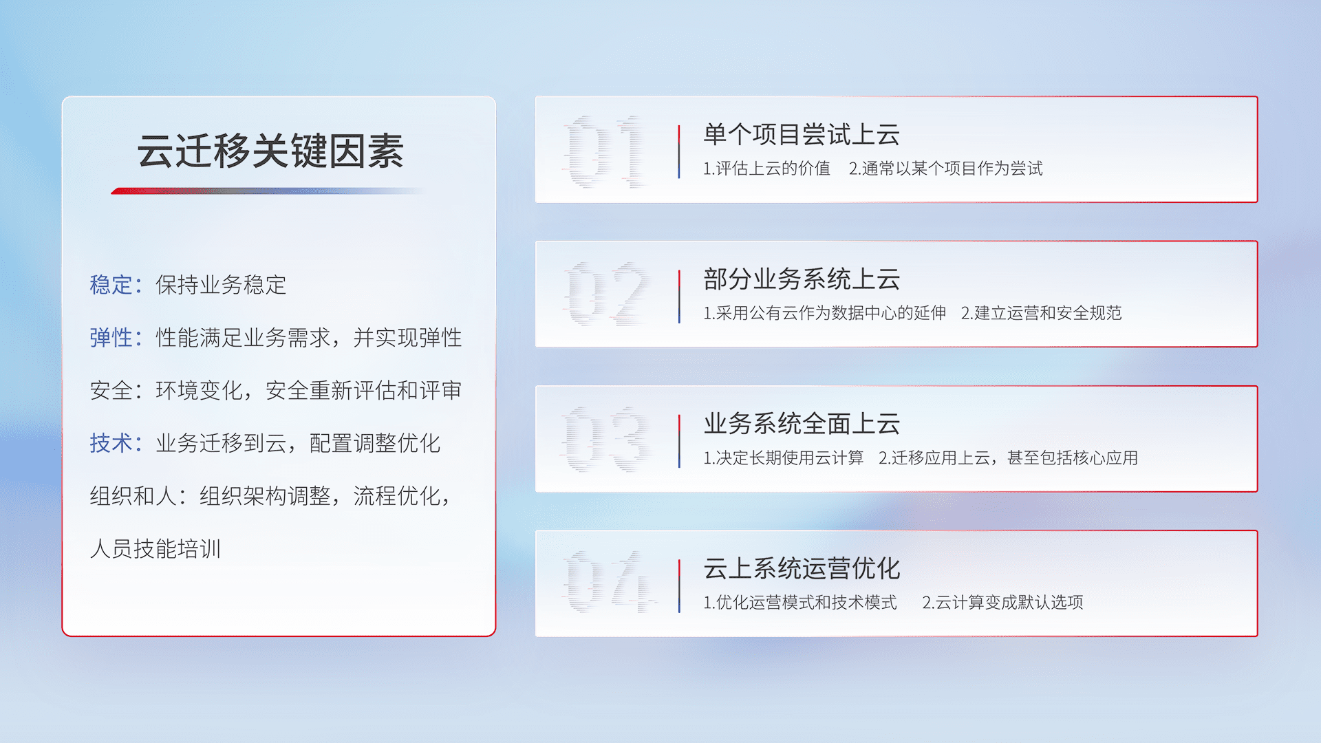 结合实际业务,,,从规划设计、、、云平台选型、、、、云原生改造、、、数据迁移、、、集成交付,,,,迁移全过程为客户识别最佳上云路径,,,,做好风险识别管理,,,,设计网络架构、、身份权限、、安全审计合规、、、、操作审计、、日志审计、、、监控告警策略、、、、多站点容灾设计等,,,对云上基础设施进行整体规划,,,提升IT治理水平,,以满足弹性、、、高可用、、、高性能的需求。。。