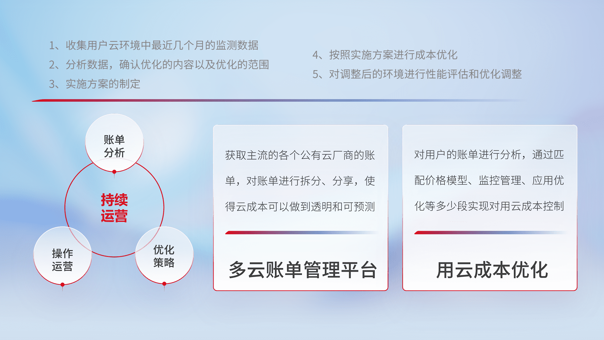 通过多云纳管,,以统一的资源数据模型把客户的云资源进行抽象和封装,,,进而实现对多云资源的统一操作,,,,保障云资源管理的可靠性、、稳定性与可用性。。量身定制化运维内容,,配置、、开发运维、、、、补丁管理、、、备份、、、、监控、、、、认证和访问管理、、、审计和日常巡检等,,,保障在用云过程中的可靠度,,,,稳定度以及高可用率。。。。